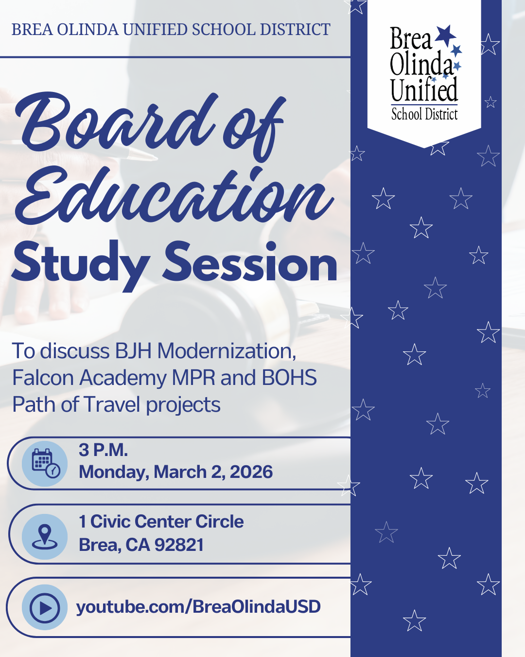 The Brea Olinda Unified School District Board of Education will hold a Study Session to discuss Measure H Bond projects including the modernization of Brea Junior High, Falcon Academy, and Brea Olinda High School's Path of Travel projects on Monday, March 2 at 3 p.m. in the Brea City Council Chambers.